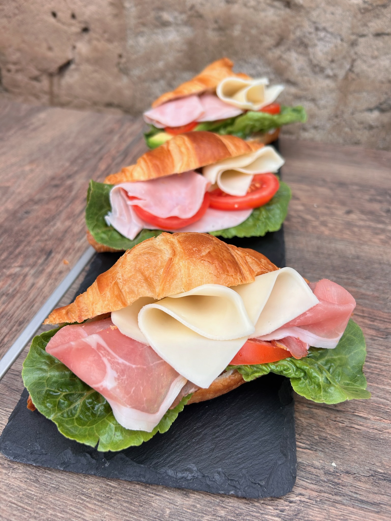 Lehký a křupavý máslový croissant plněný Schwarzwaldskou šunkou, sýrem, ledovým salátem, rajčetem a salátovou okurkou.