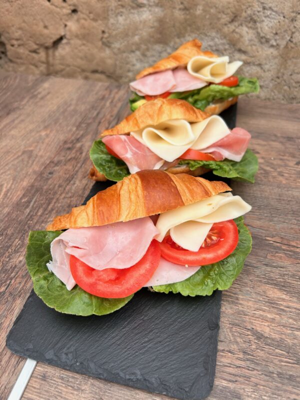 Lehký a křupavý máslový croissant plněný šunkou, sýrem, ledovým salátem, rajčetem a salátovou okurkou.