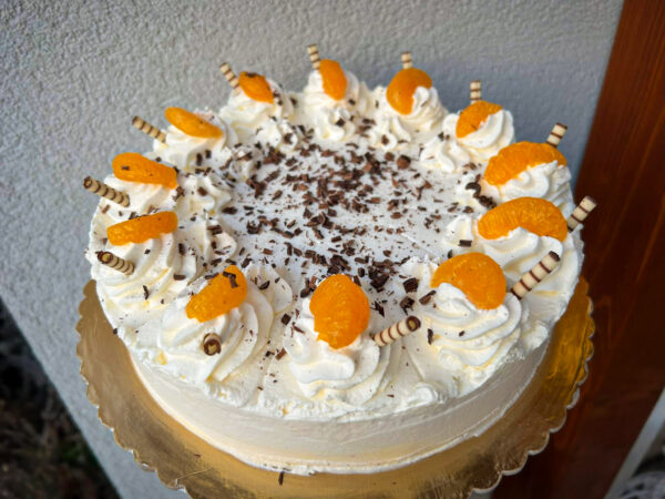 Vanilkový korpus plněný pudinkovým krémem a nakládaným ovocem, zdobený šlehačkou.