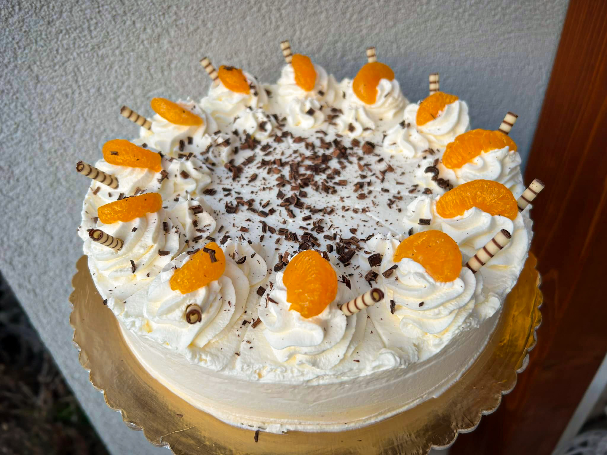 Vanilkový korpus plněný pudinkovým krémem a nakládaným ovocem, zdobený šlehačkou.