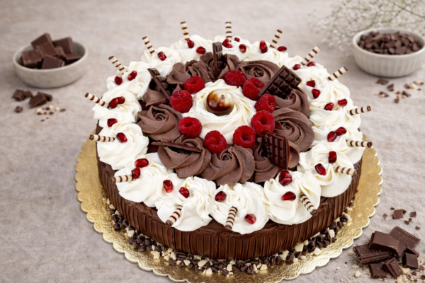 Kakaový korpus, plněný světlou a pařížskou šlehačkou, zalitý v čokoládě.