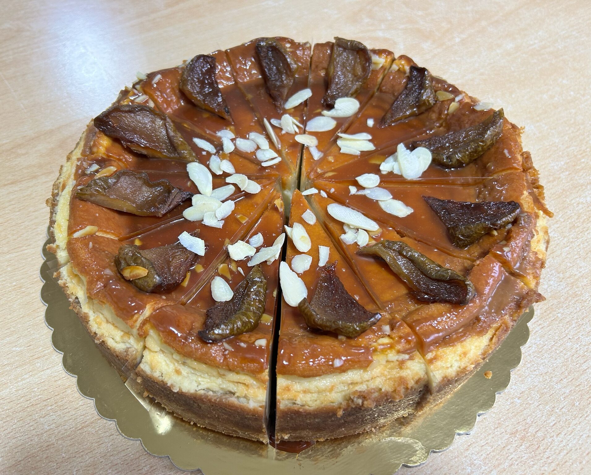 Jemná hrušková náplň z mascarpone, kysané smetany s hřebíčkem a badyánem pečené na máslových sušenkách, navrch zalité karamelem, zdobeno pečenými hruškami.