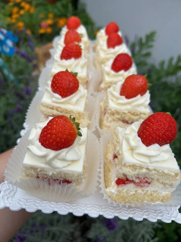 Jemný vanilkový korpus naplněný krémem z mascarpone a šlehačky proložené čerstvými jahodami, ozdobené jahodou a čokoládovou dekorací. Kostka má rozměr 4×4 cm.