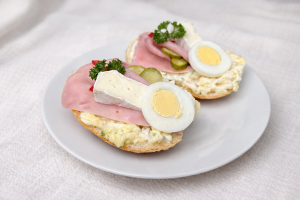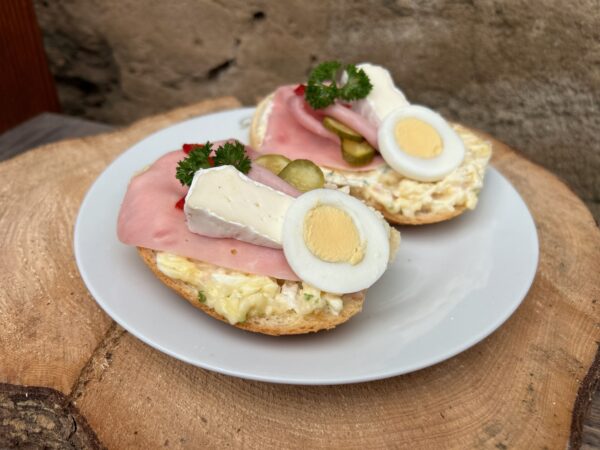 Veka natřená hermelínovou pomazánkou vlastní výroby, ozdobený plátkem vepřové šunky, vařeným vajíčkem, plátkem hermelínu, sterilovanou okurkou a paprikou.