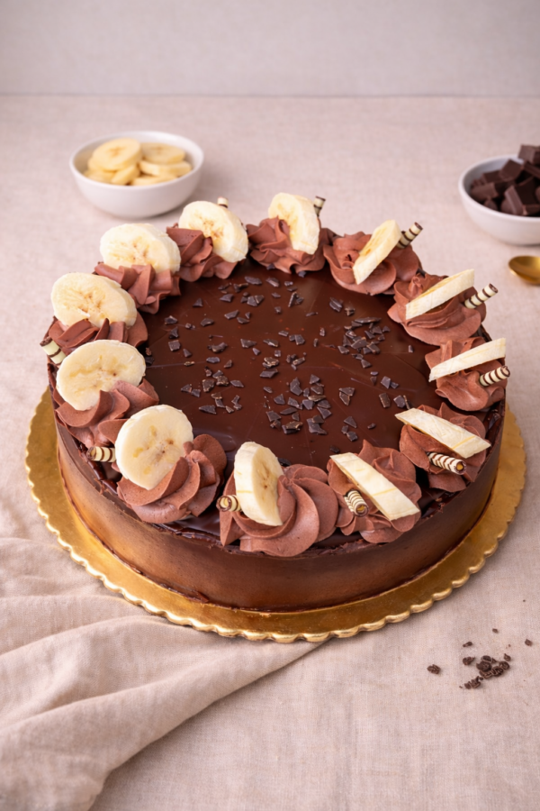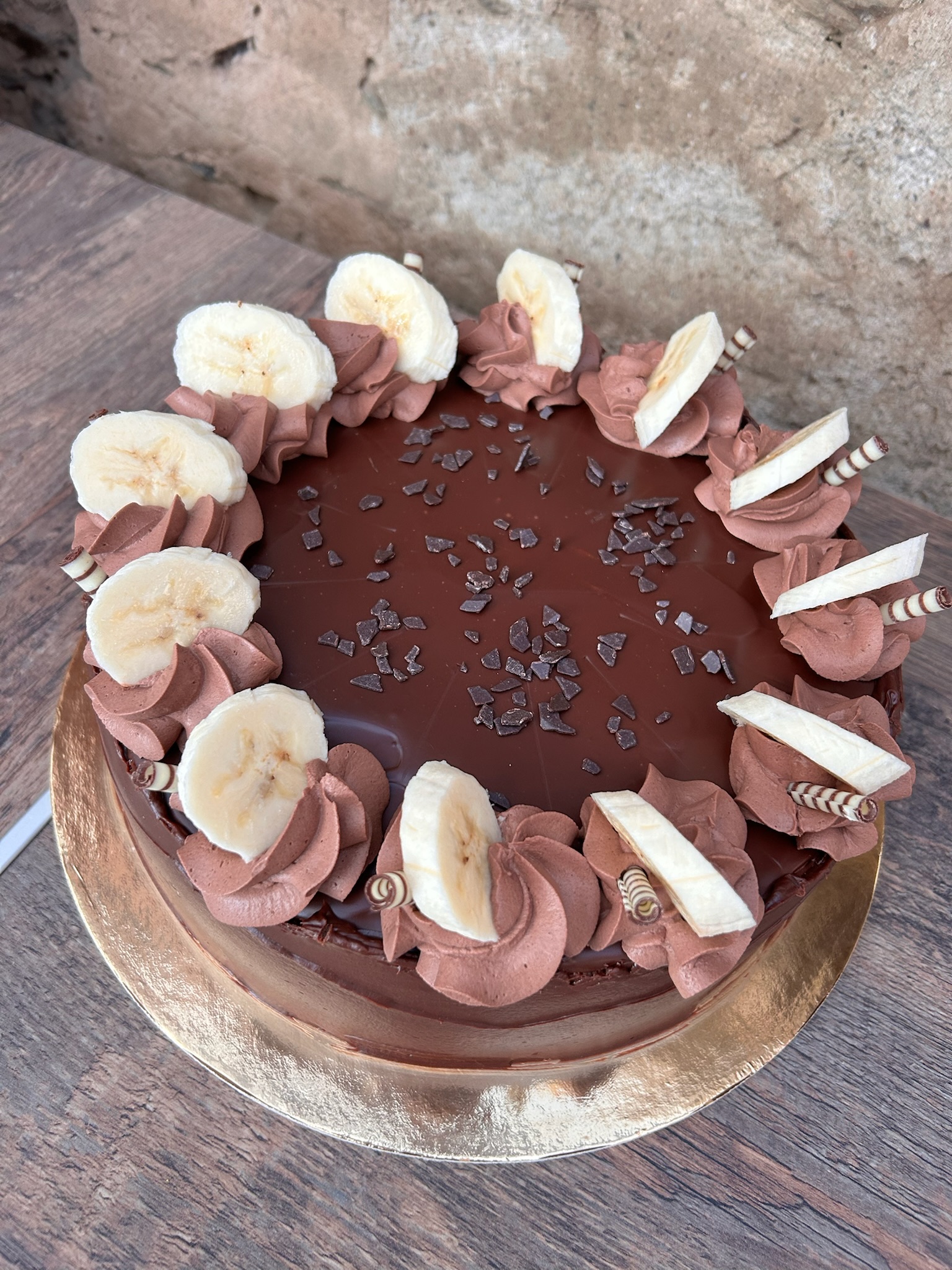 Kakaový korpus plněný pařížskou šlehačkou, prokládaný banány a zalitý čokoládou.