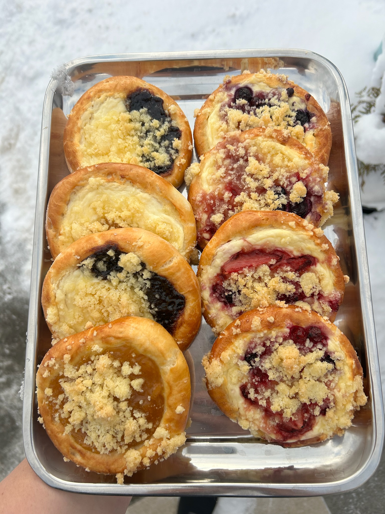 Nadýchané kynuté těsto s různými náplněmi. Naše nabídka zahrnuje tvaroh s ovocem, jablečná povidla, švestková povidla, mák, ořechy.