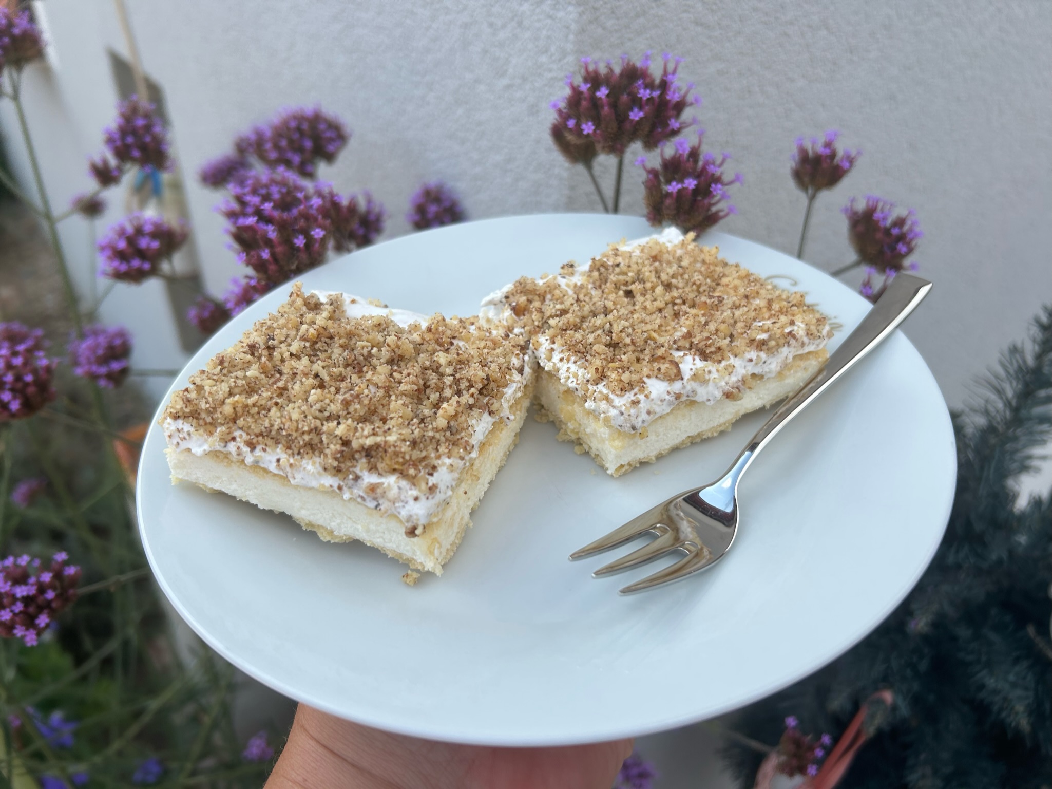 Dva křehké korpusy spojeny krémovou náplní z másla. Zakončeno vrstvou bílkového sněhu a drcenými ořechy.