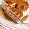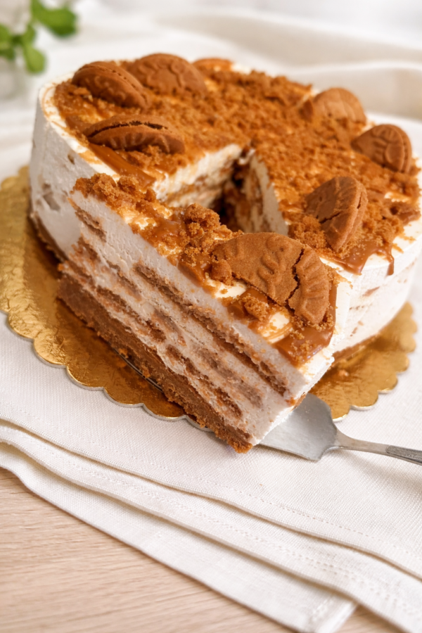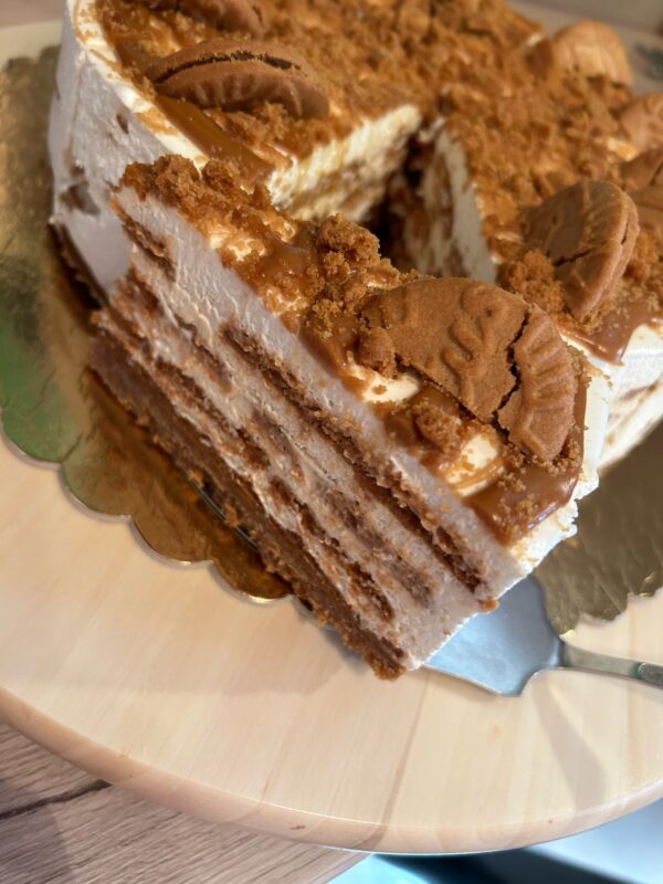 Lotuskové sušenky s máslem jako základ pro lahodný dort ze zakysané smetany, tvarohu a šlehačky prokládaný lotuskovými sušenkami.
