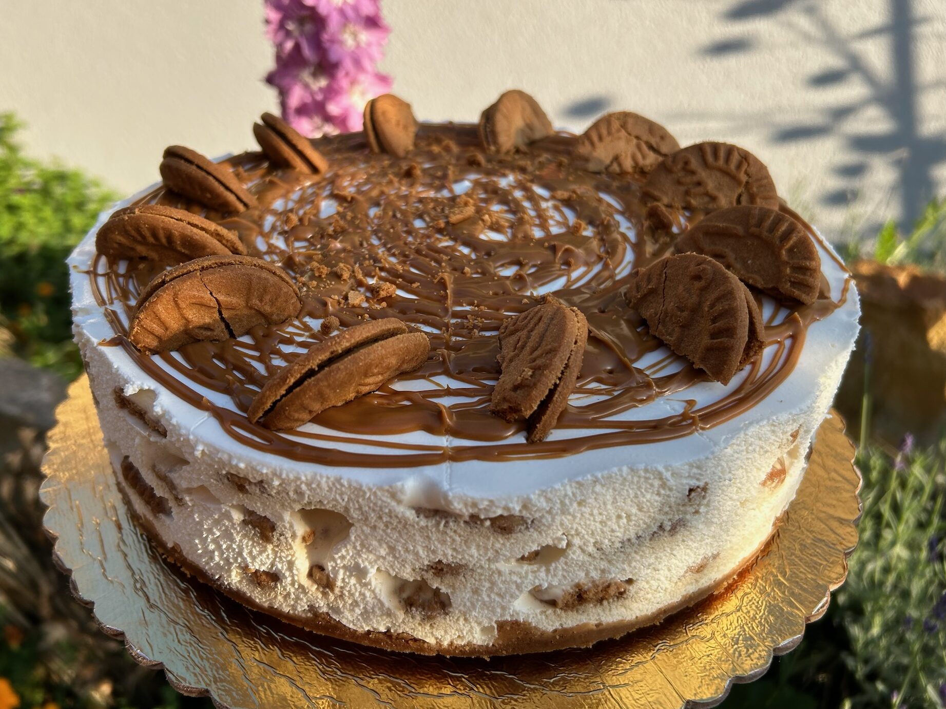 Lotuskové sušenky s máslem jako základ pro lahodný dort ze zakysané smetany, tvarohu a šlehačky prokládaný lotuskovými sušenkami.