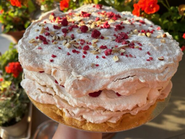 Křehké lískoořískové placky z bílků plněné šlehačkou a malinami.