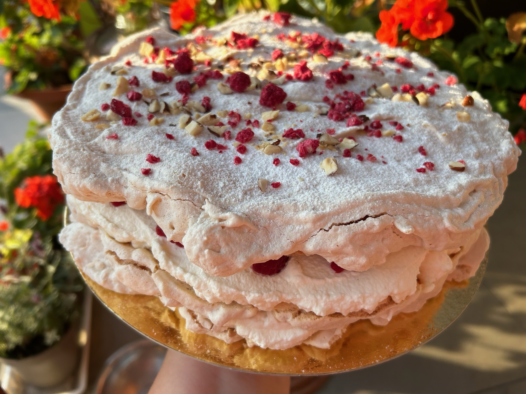 Křehké lískoořískové placky z bílků plněné šlehačkou a malinami.