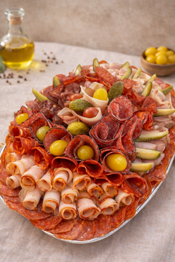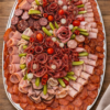 Mix vybraných salámů zdobených sterilovanou okurkou nebo cibulkou a cherry rajčátkem.