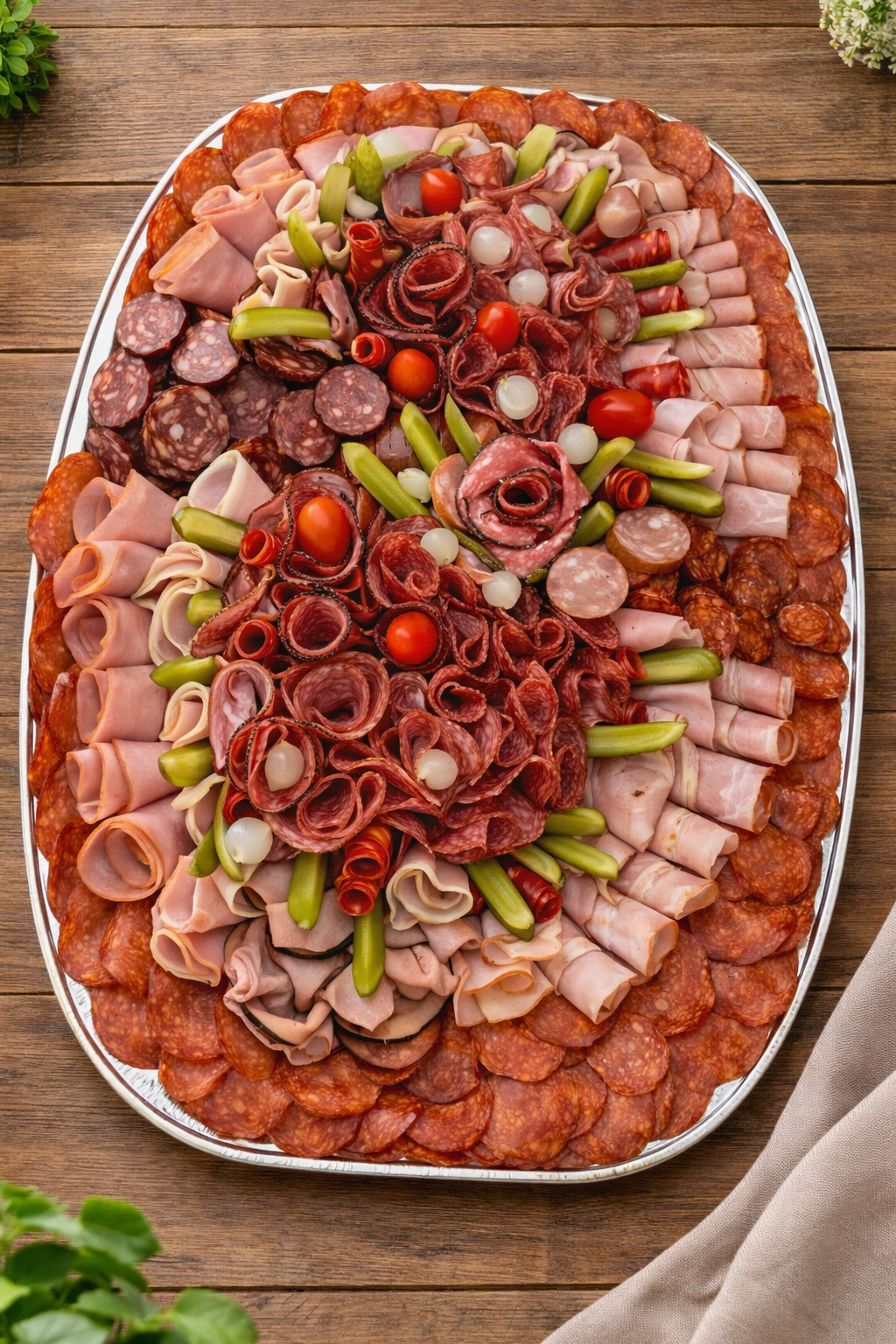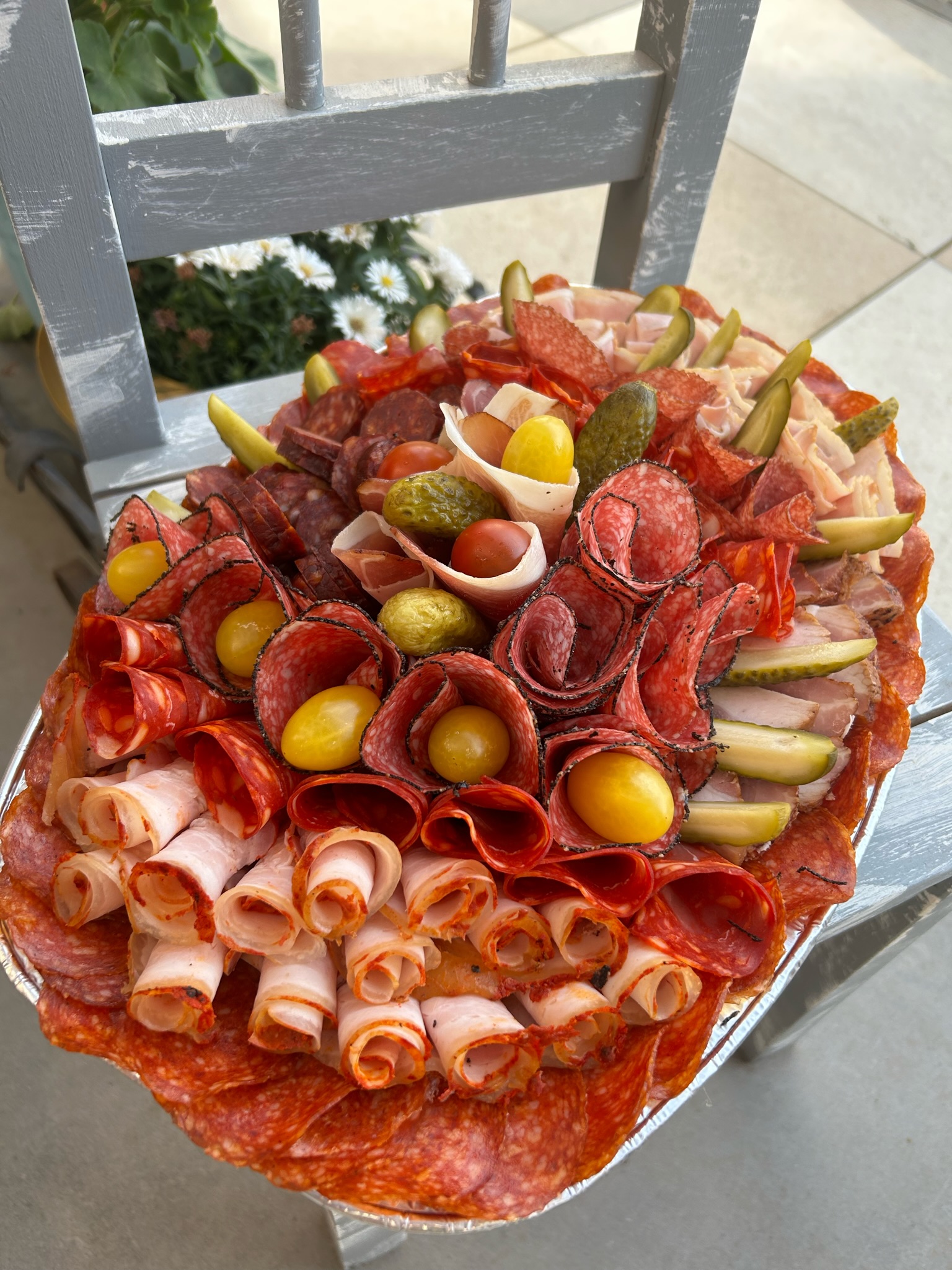 Mix vybraných salámů zdobených sterilovanou okurkou nebo cibulkou a cherry rajčátkem.