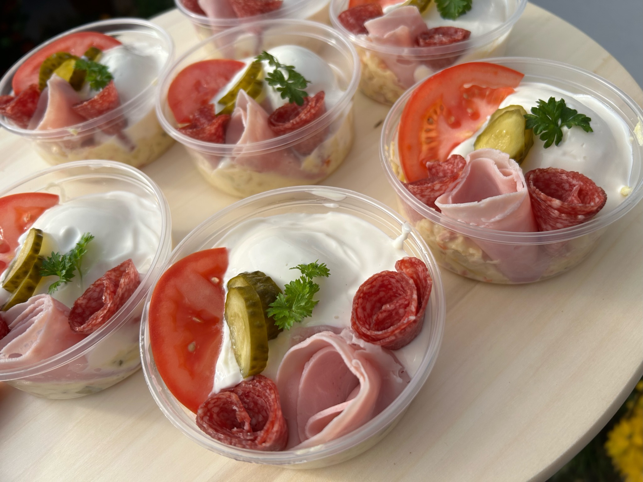 Bramborový salát obložený vařeným vajíčkem polité majonézou, dvěmi kolečky suchého salámu / či plátkem šunky, sterilovanou okurkou a čerstvým rajčátkem. 140 g.
