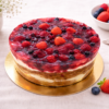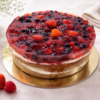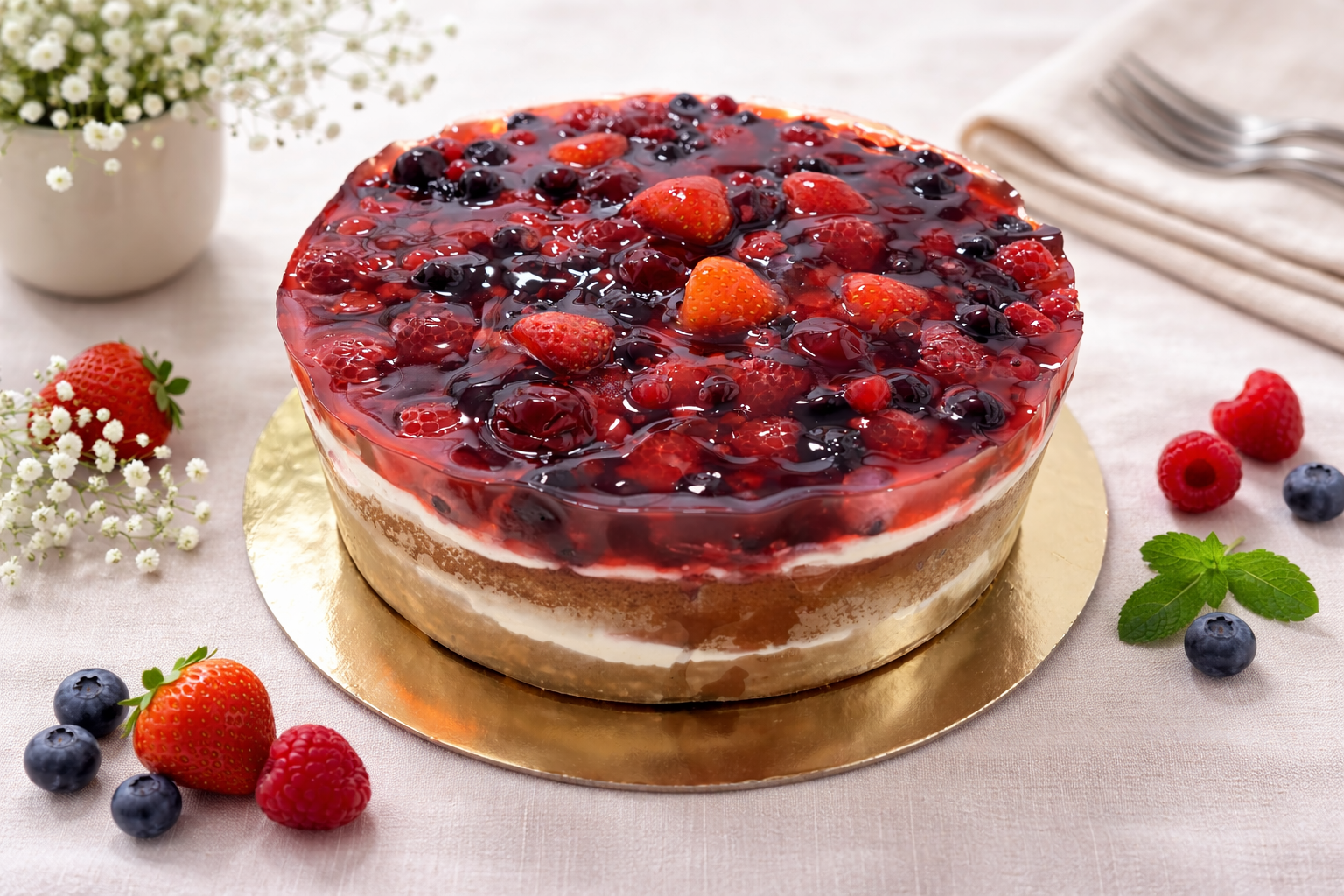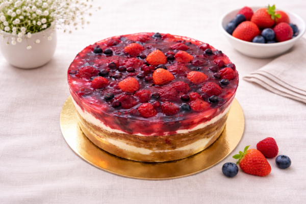Vanilkový korpus, naplněný tvarohem se šlehačkou. Vrchol dortu zdobí čerstvé ovoce v želé.