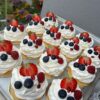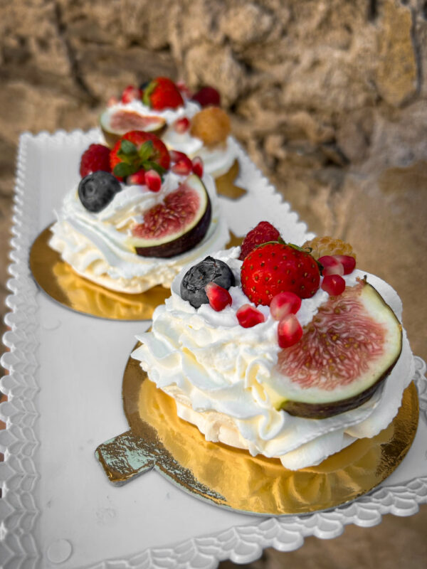 Křehký korpus z bílků plněný smetanou a nazdobený čerstvým ovocem.