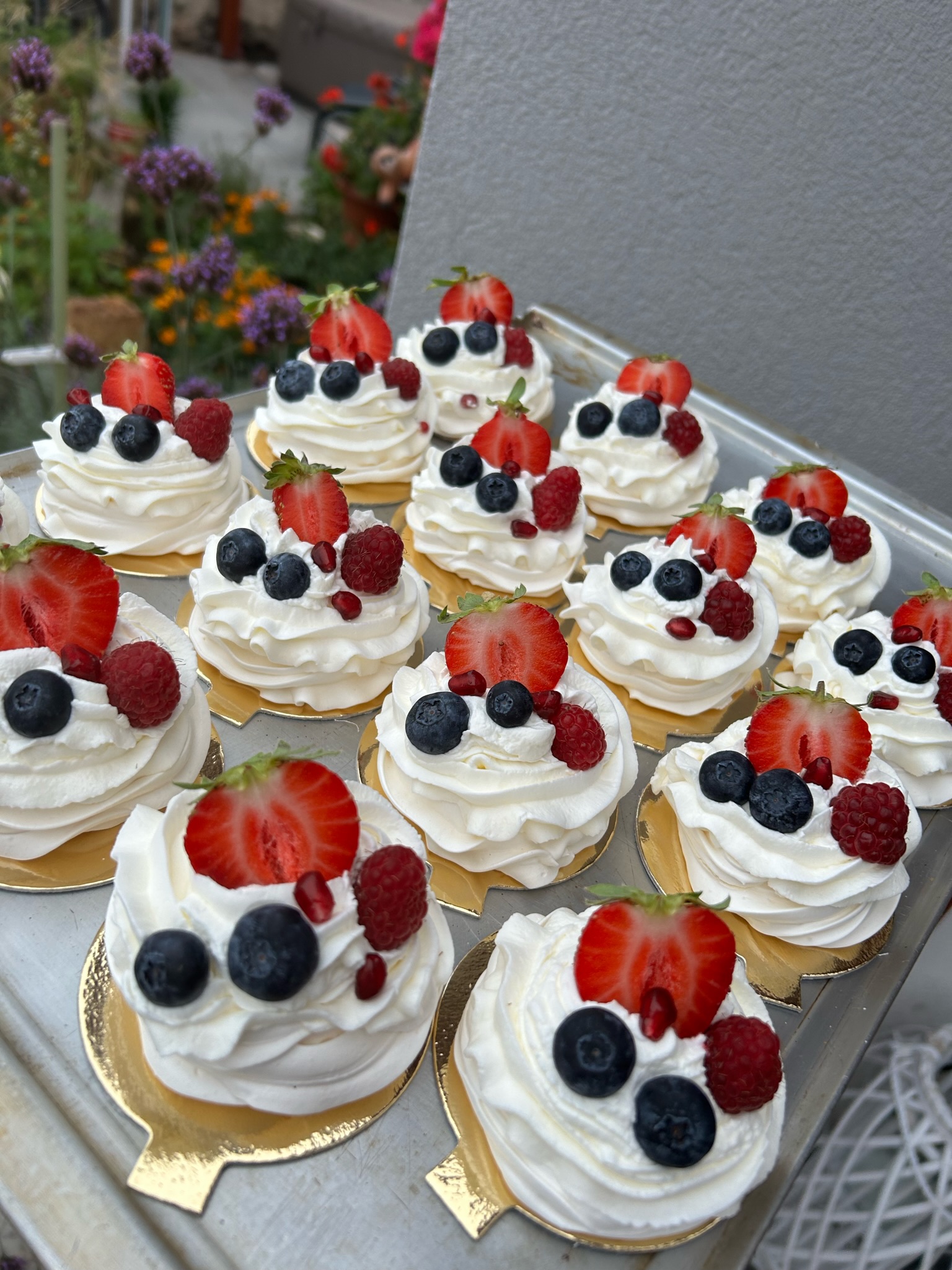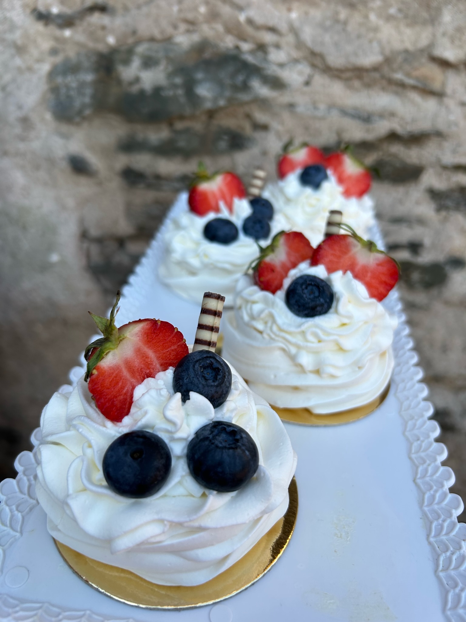 Křehký korpus z bílků plněný smetanou a nazdobený čerstvým ovocem.