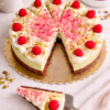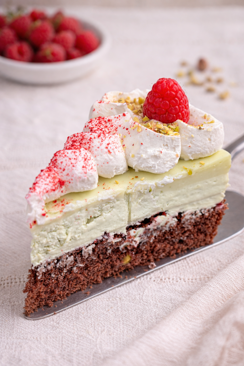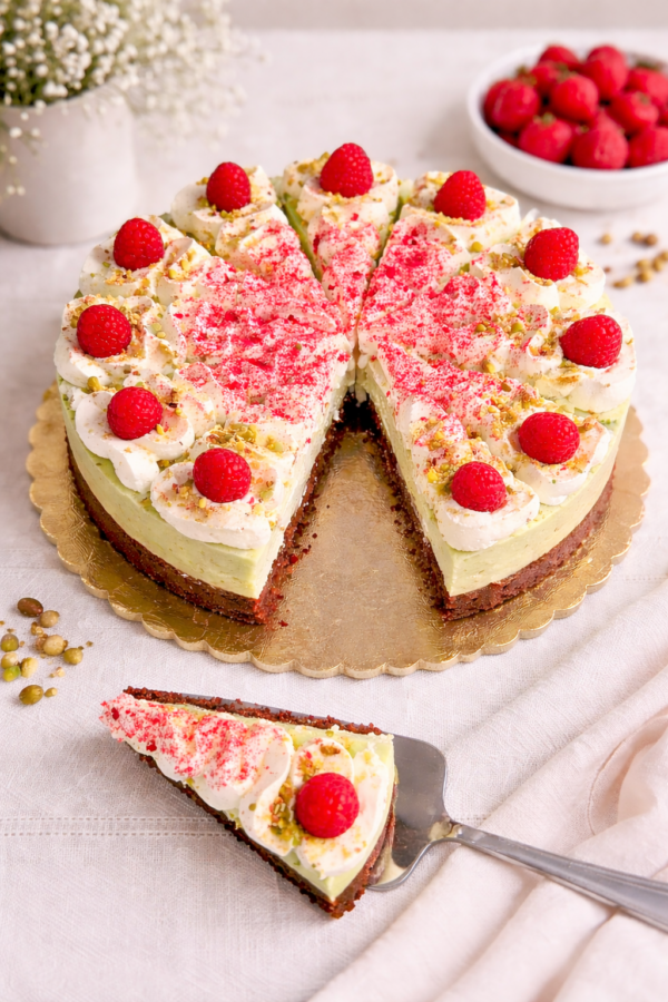 Lehký a vláčný pistáciový dort začíná čokoládovým korpusem potřeným pikantní marmeládou, na kterou se vrství krémová pistáciová náplň z mascarpone a šlehačky. Vršek dortu je zdobený šťavnatými malinami a sekanými pistáciemi.