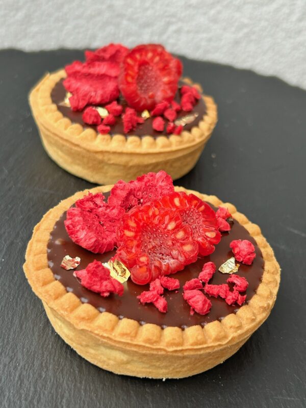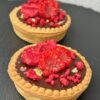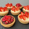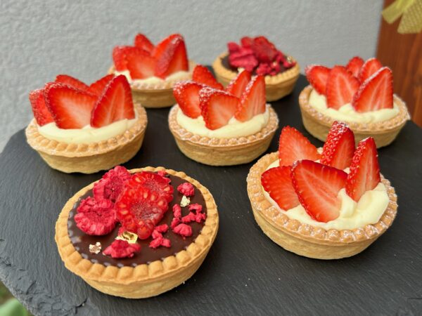 Nabízíme vanilkový krém zdobený ovocem, pařížskou náplň zalitou čokoládovou ganache nebo košíček může být plněný vaječným likérem se smetanou a bílou čokoládou, zdobené borůvkovým krémem.