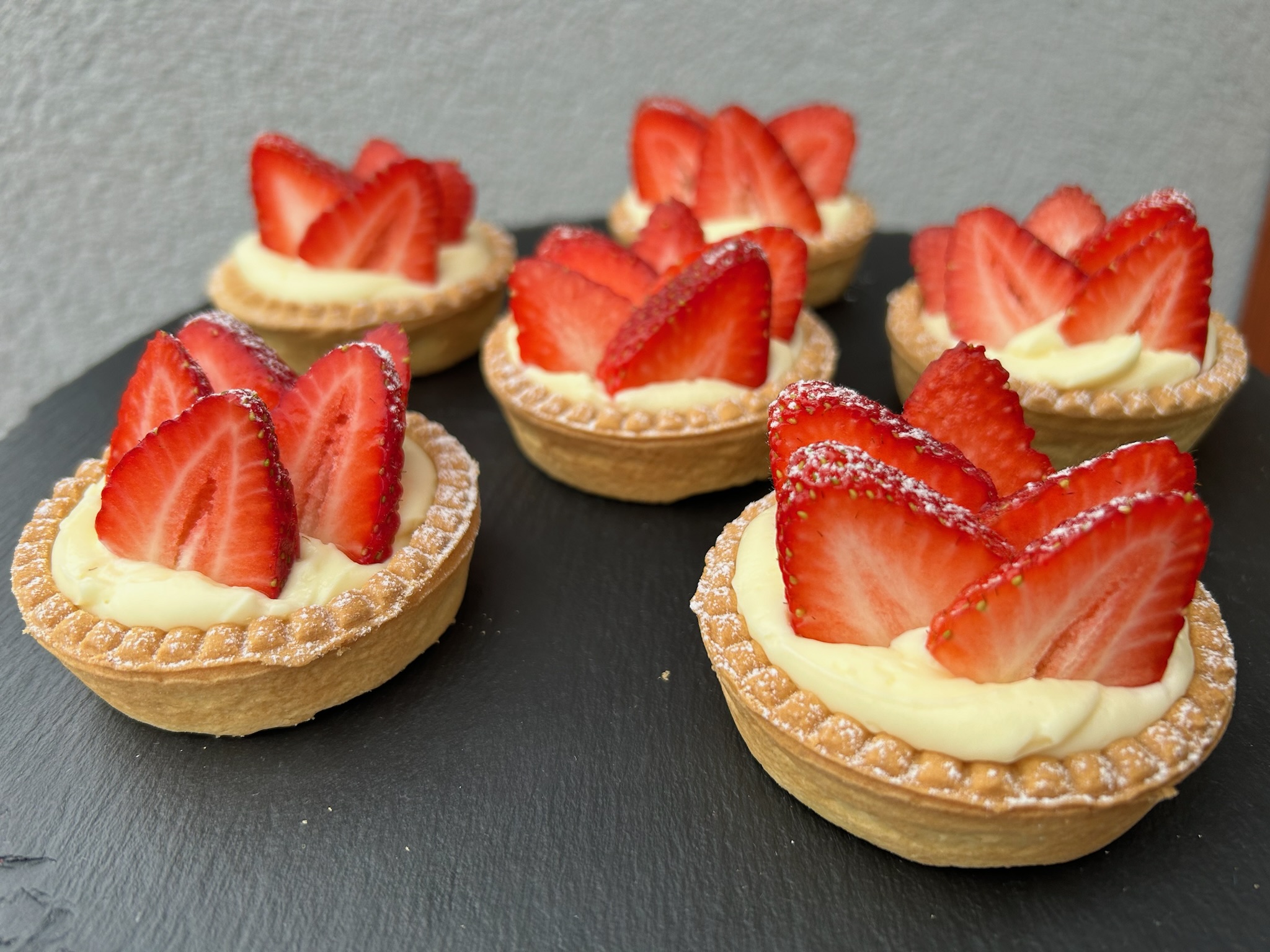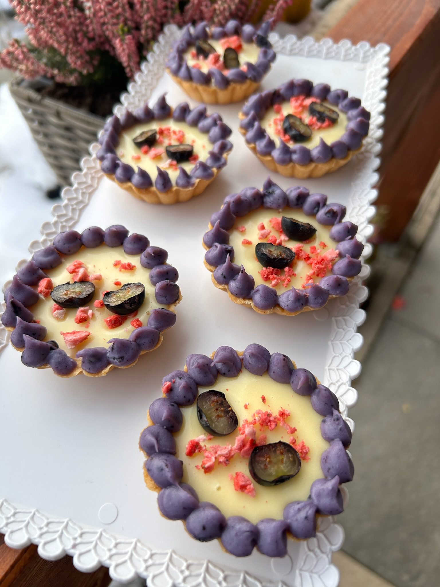Nabízíme vanilkový krém zdobený ovocem, pařížskou náplň zalitou čokoládovou ganache nebo košíček může být plněný vaječným likérem se smetanou a bílou čokoládou, zdobené borůvkovým krémem.