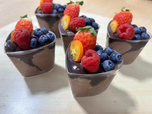 Čokoládová pěna s čokoládovou polevou zdobené čerstvým ovocem.
