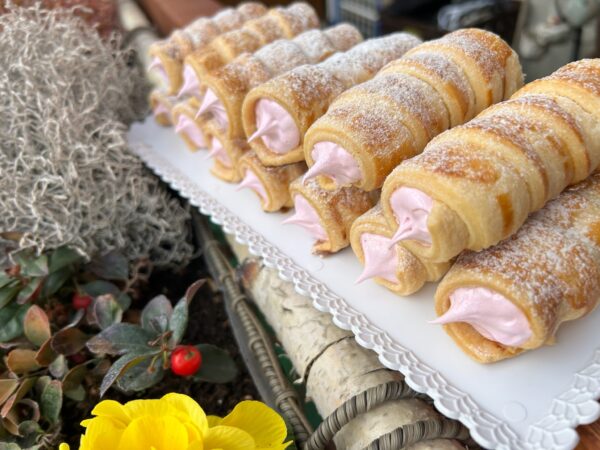 Jemná máslová trubička plněná sněhovým krémem z bílků a cukru s malinovou příchutí.