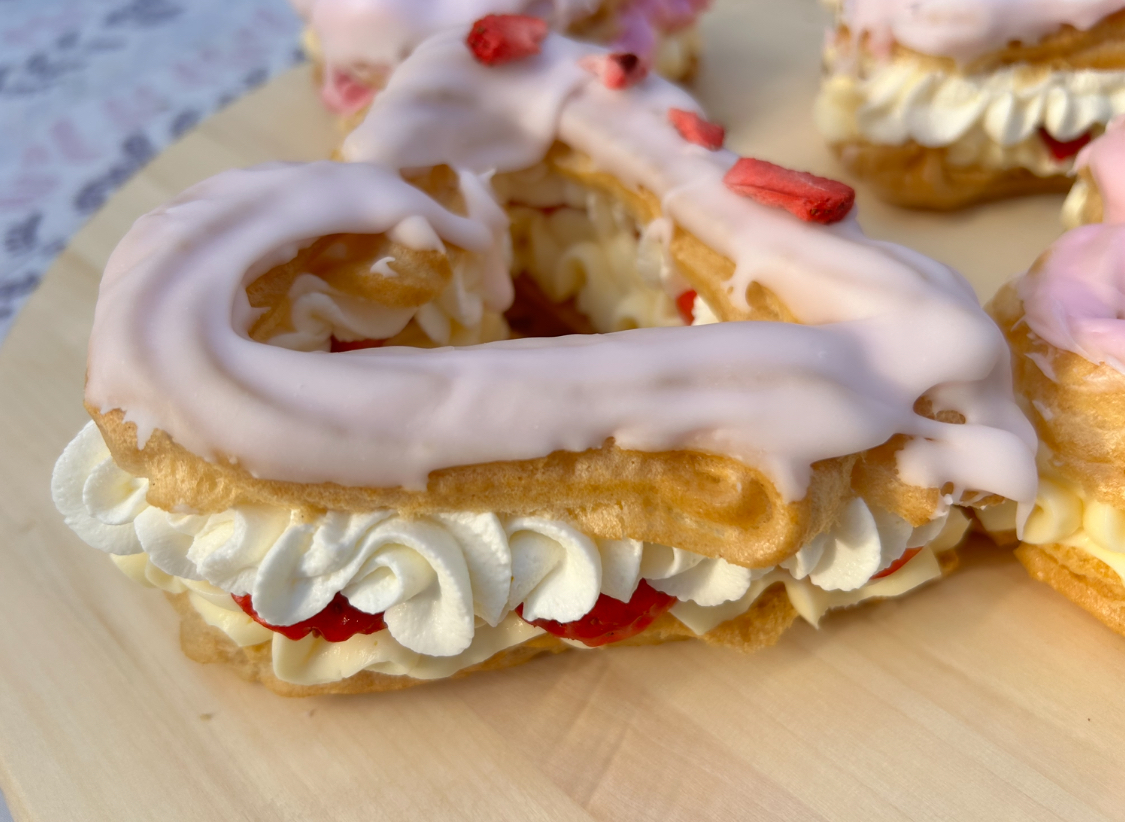 Odpalované těsto plněné vanilkovým krémem s mascarpone, čerstvými jahodami a šlehačkou. Polité cukrovou polevou.